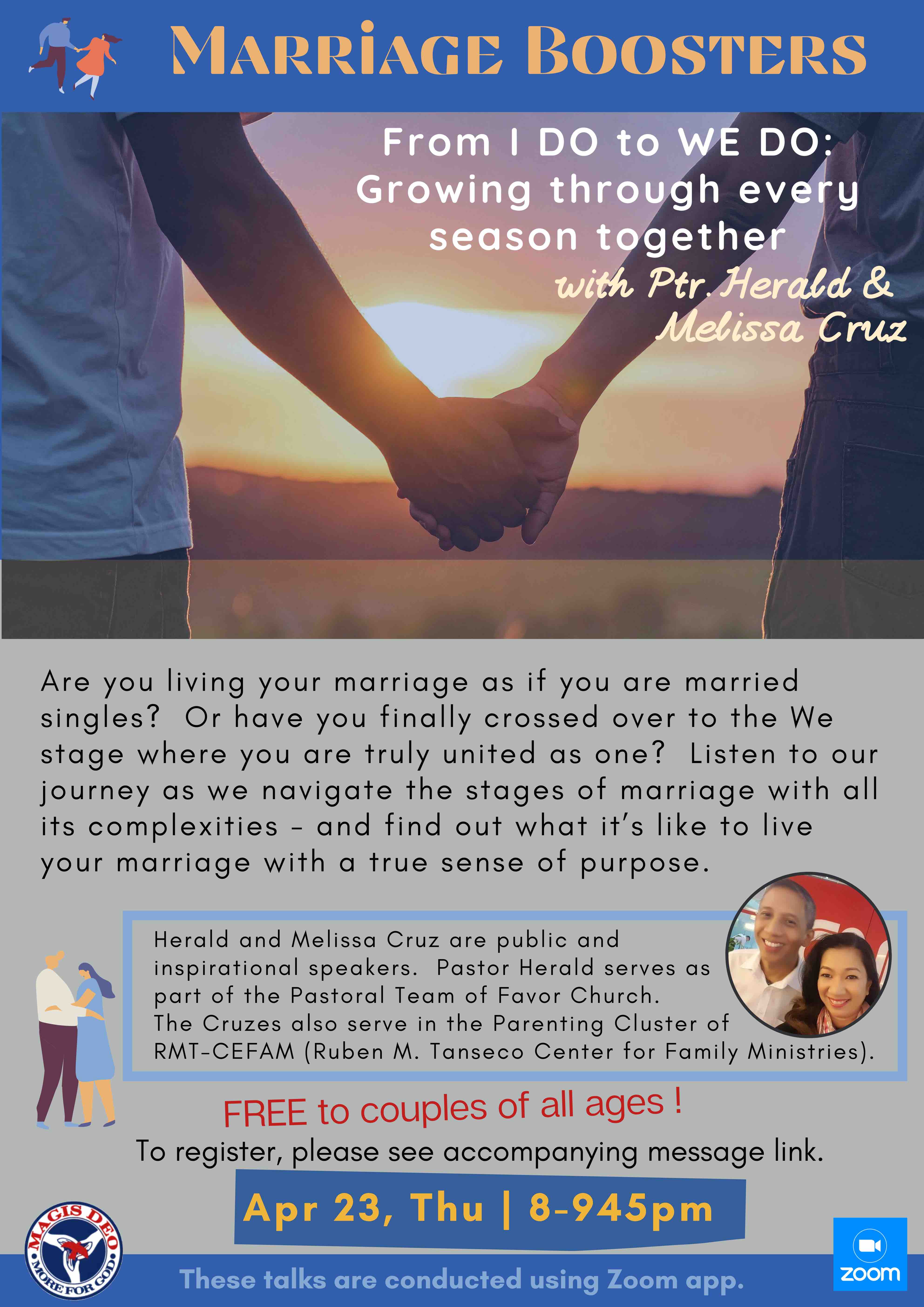 The Marriage Boosters program is an advocacy of the Magis Deo community. It was born out of the pandemic times during which our community had no ability to conduct Marriage Encounter Weekends, our primary advocacy. It was during this time that we decided to offer these free seminars in order to continue our mission of helping challenged couples. Due to the enormous positive feedback we received, we continue to offer this series today. We hold three Marriage Booster topics every year.
