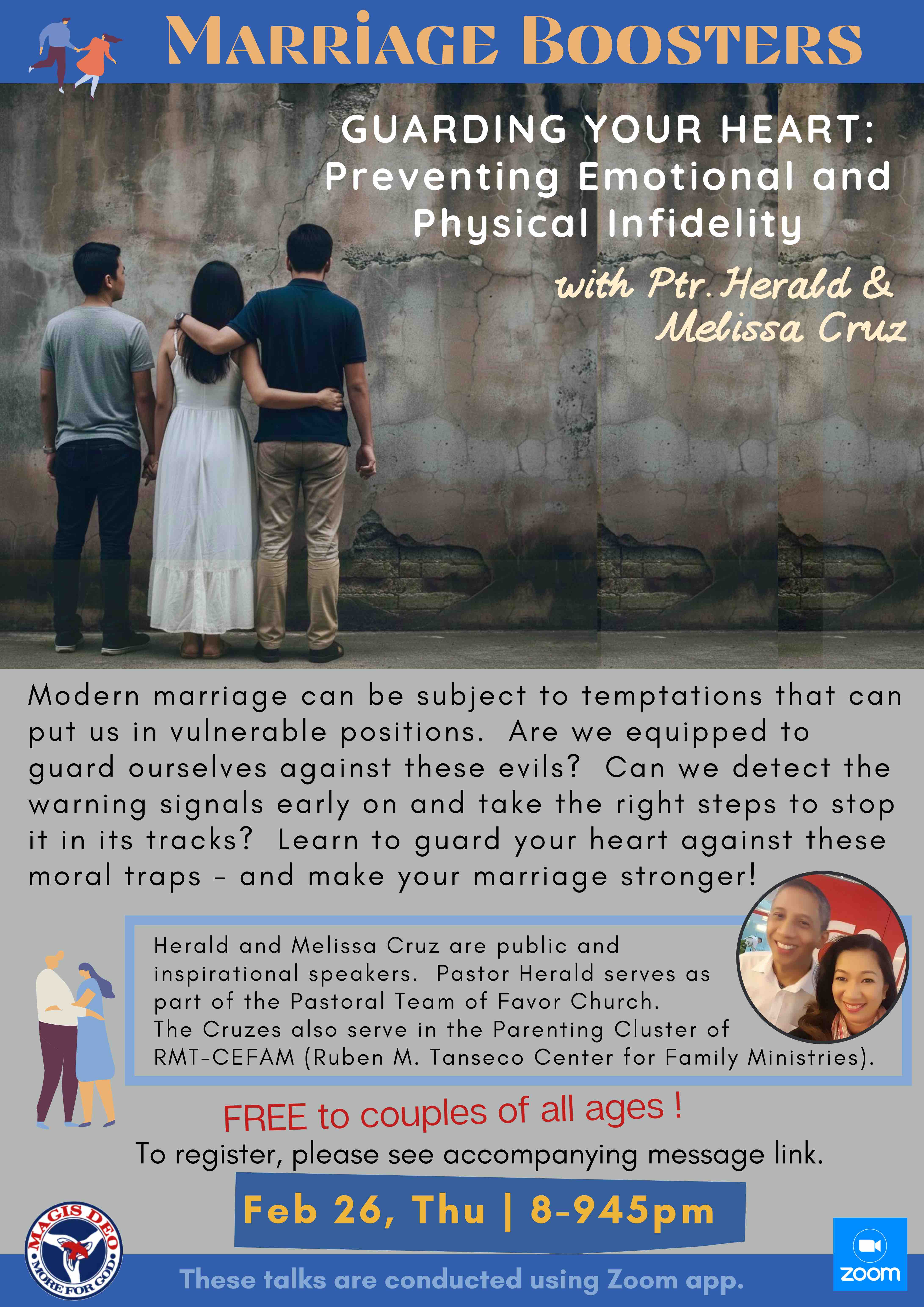 The Marriage Boosters series of talks are intended for married couples. It is a Zoom-based seminar that lasts for two hours and features a lecture given by a priest or topic expert, followed by a Q&A segment. Topics typically tackle marriage relationship challenges such as infidelity, lack of communication between spouses, relationships with in-laws, addiction, and other real-life challenges and situations affecting married couples.