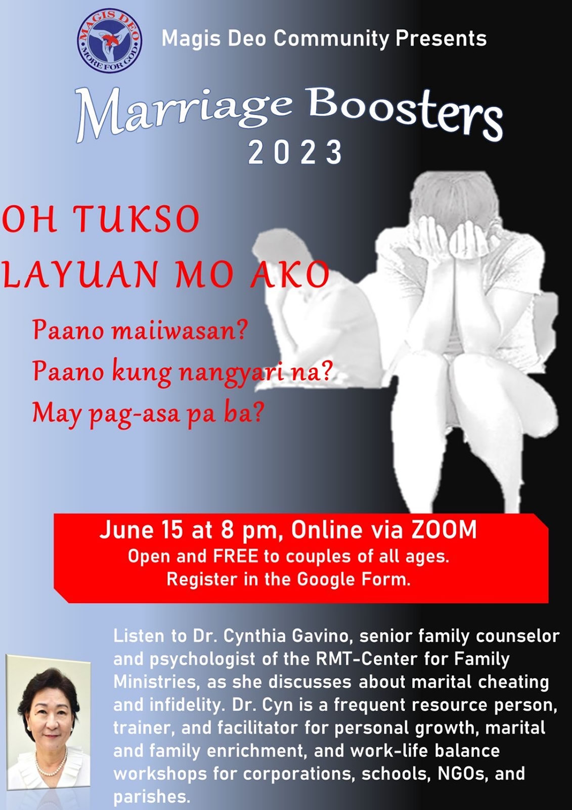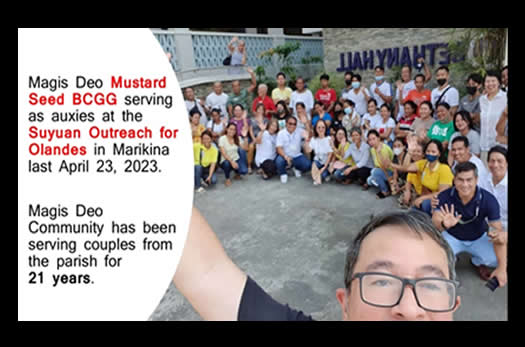 Following this, the ME Class go through a Spiritual Deepening Retreat (SDR), a multi-sectoral live-in weekend. Upon completion of this retreat, the class is invited to join the Basic Christian Growth Group (BCGG), which is composed of 5 to 10 couples and headed by a Shepherd Couple. The BCGGs perform regular faith sharing and accompany each other thru their spiritual and couple journey. At this point, the members of the ME Class can be commissioned as Magis Deo Community members.
