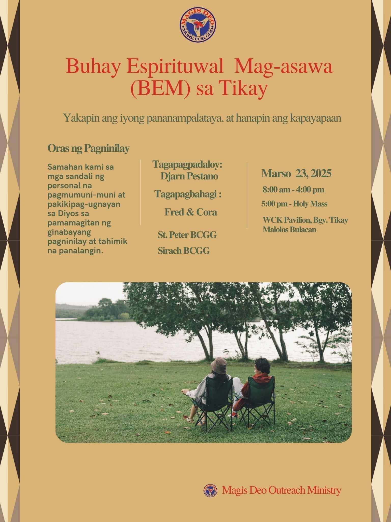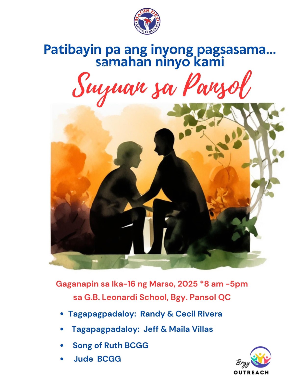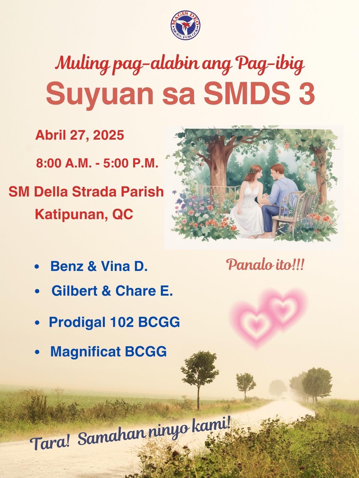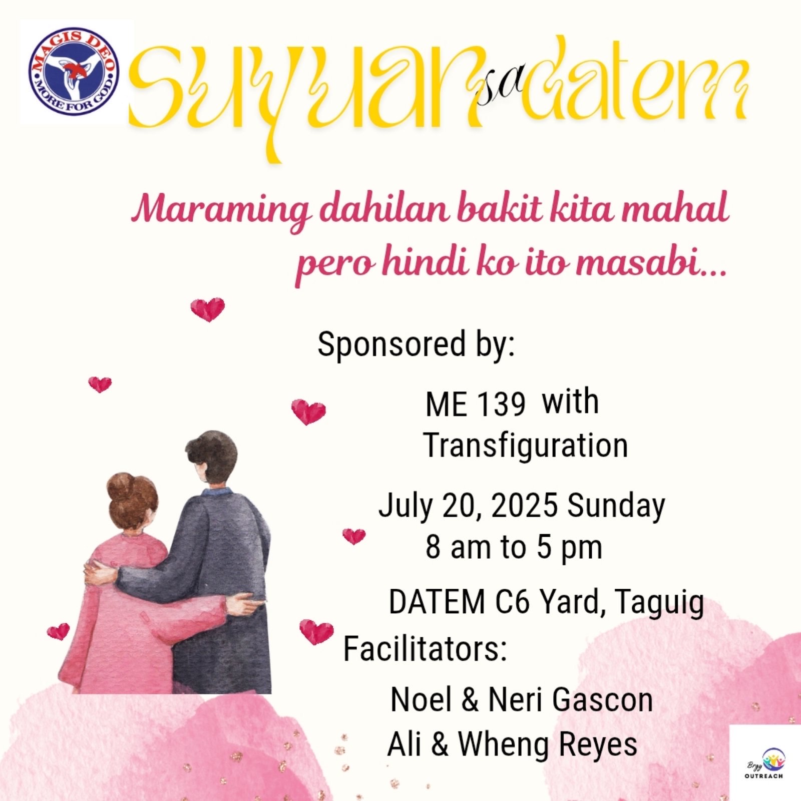 The Suyuan is a one-day marriage enrichment seminar intended to introduce the Marriage Encounter Weekend principles to the underprivileged communities. These are held using Tagalog language. Magis Deo has been holding Suyuans since 1994 (and as far back as 1998 with UGAT foundation) and has sponsored more than 200 Suyuans around the nation.