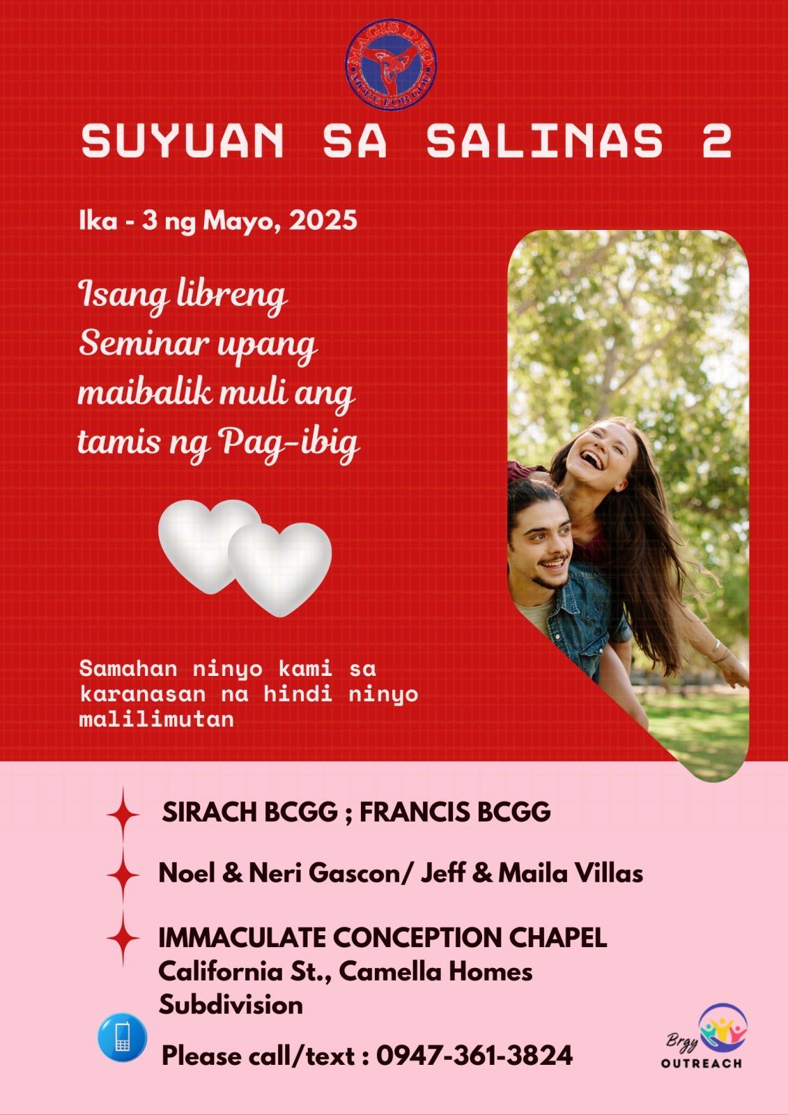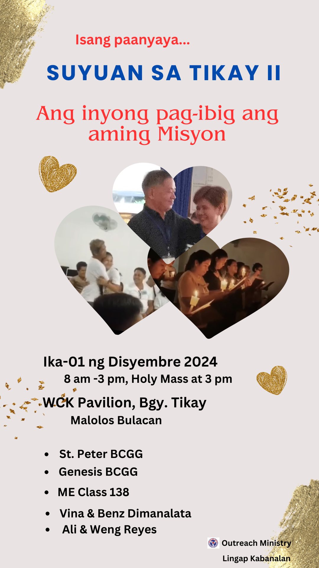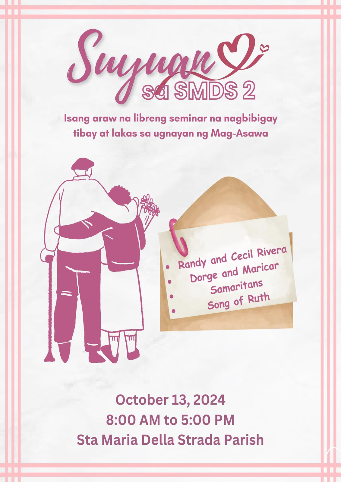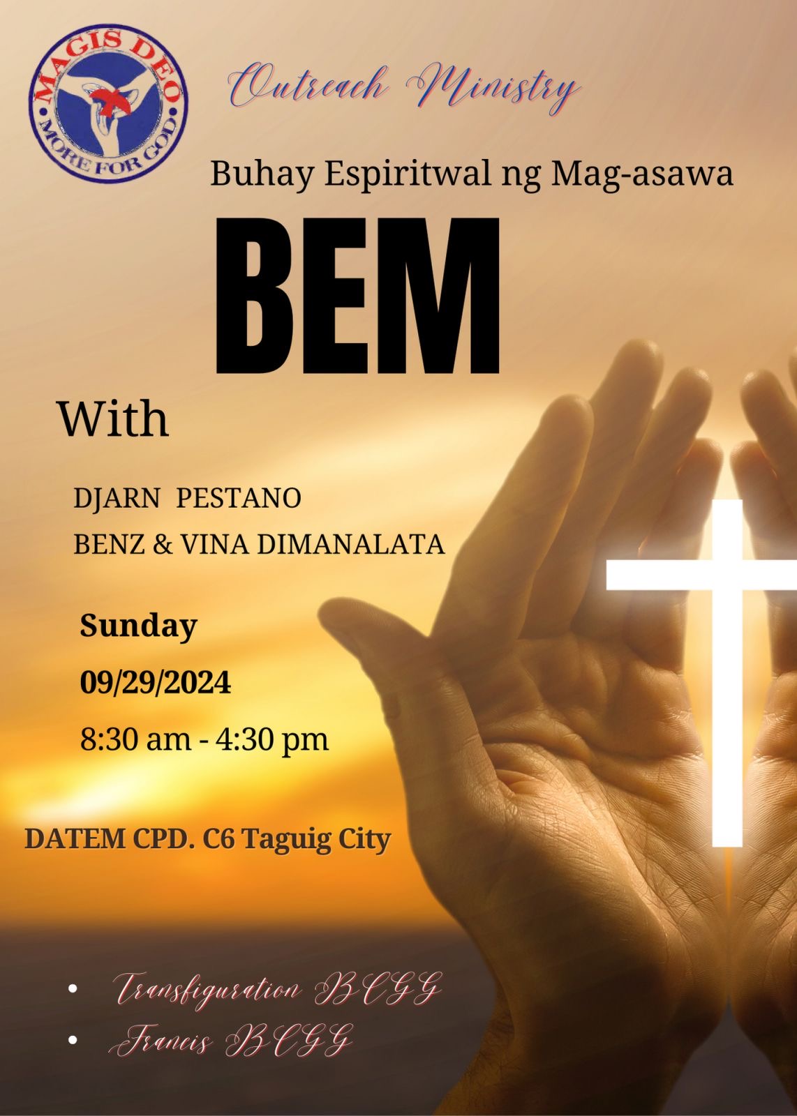 The Suyuan is a one-day marriage enrichment seminar intended to introduce the Marriage Encounter Weekend principles to the underprivileged communities. These are held using Tagalog language. Magis Deo has been holding Suyuans since 1994 (and as far back as 1998 with UGAT foundation) and has sponsored more than 200 Suyuans around the nation.