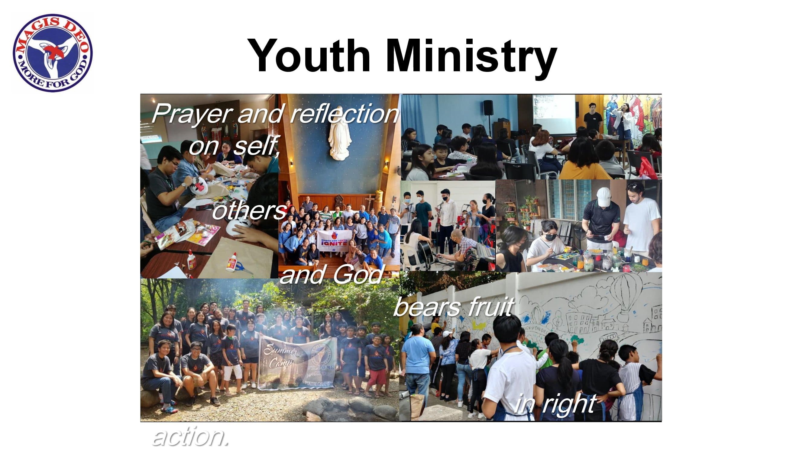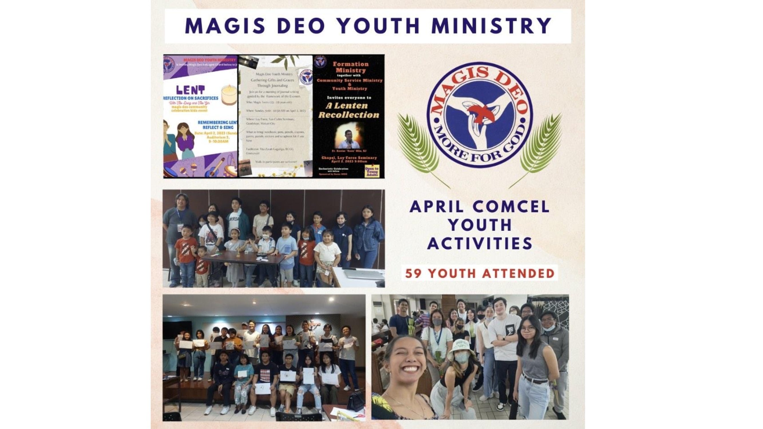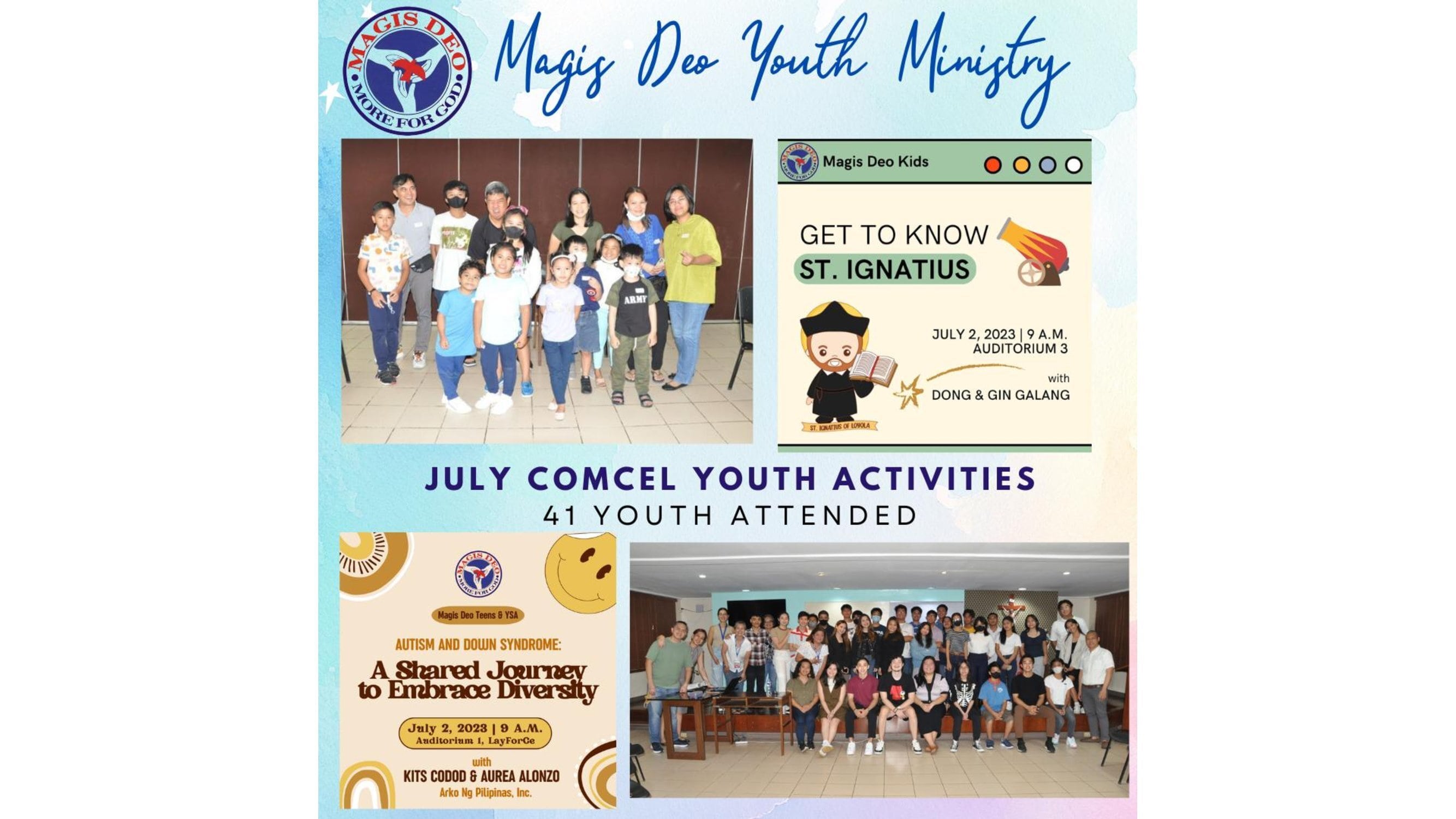 Provide the youth with Ignatian formation towards mature relationships with God, family and community appropriate to their life stages. Enhance their service and leadership capacities Provide them with opportunities for community involvement to build God's kingdom within and beyond the Magis Deo Community