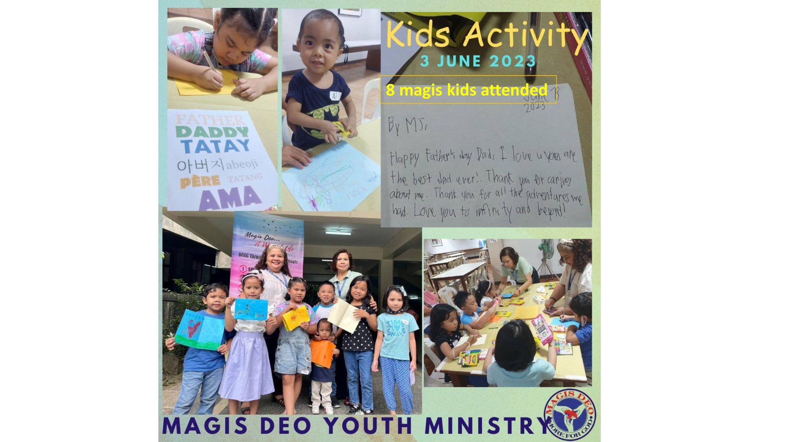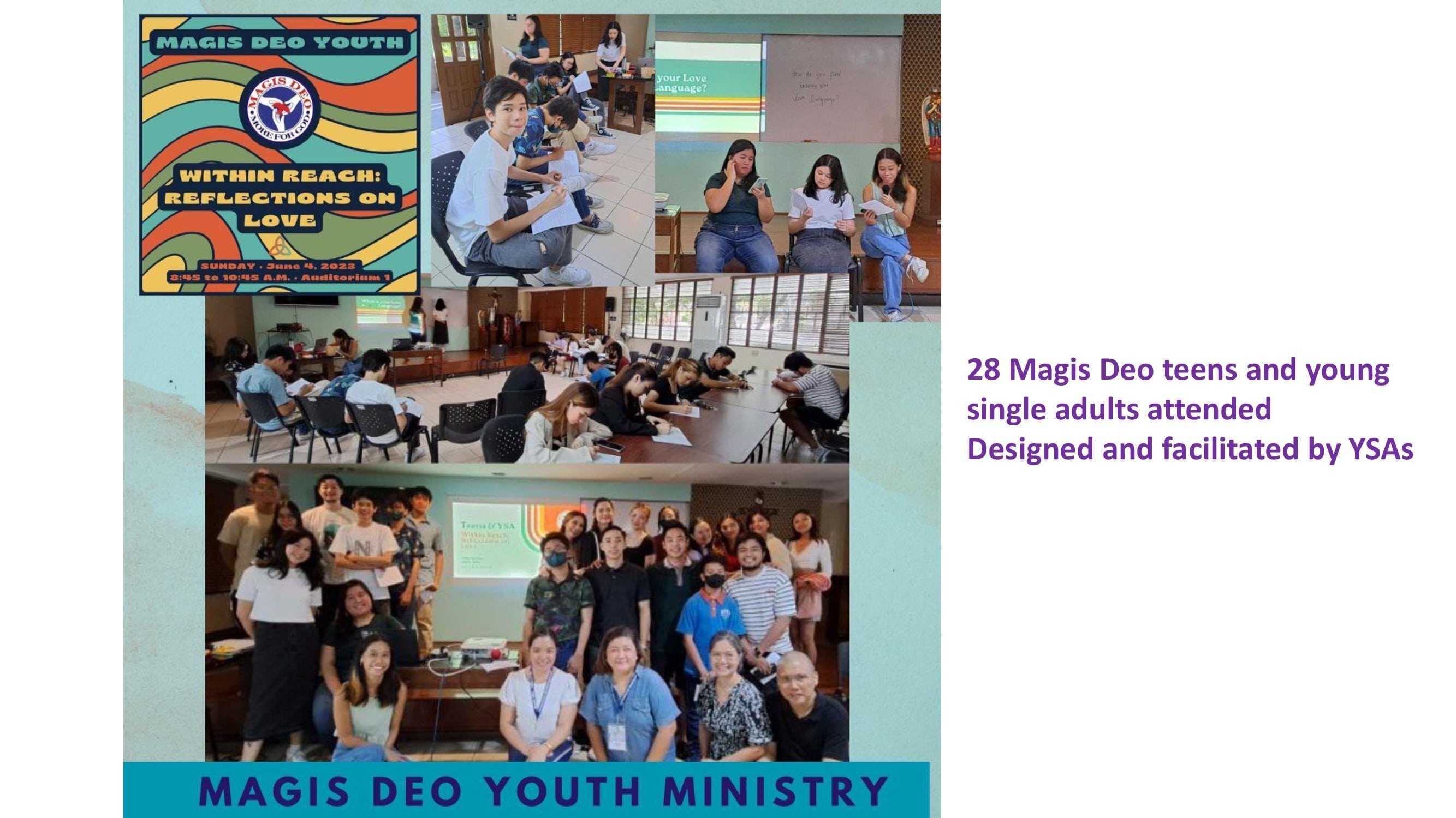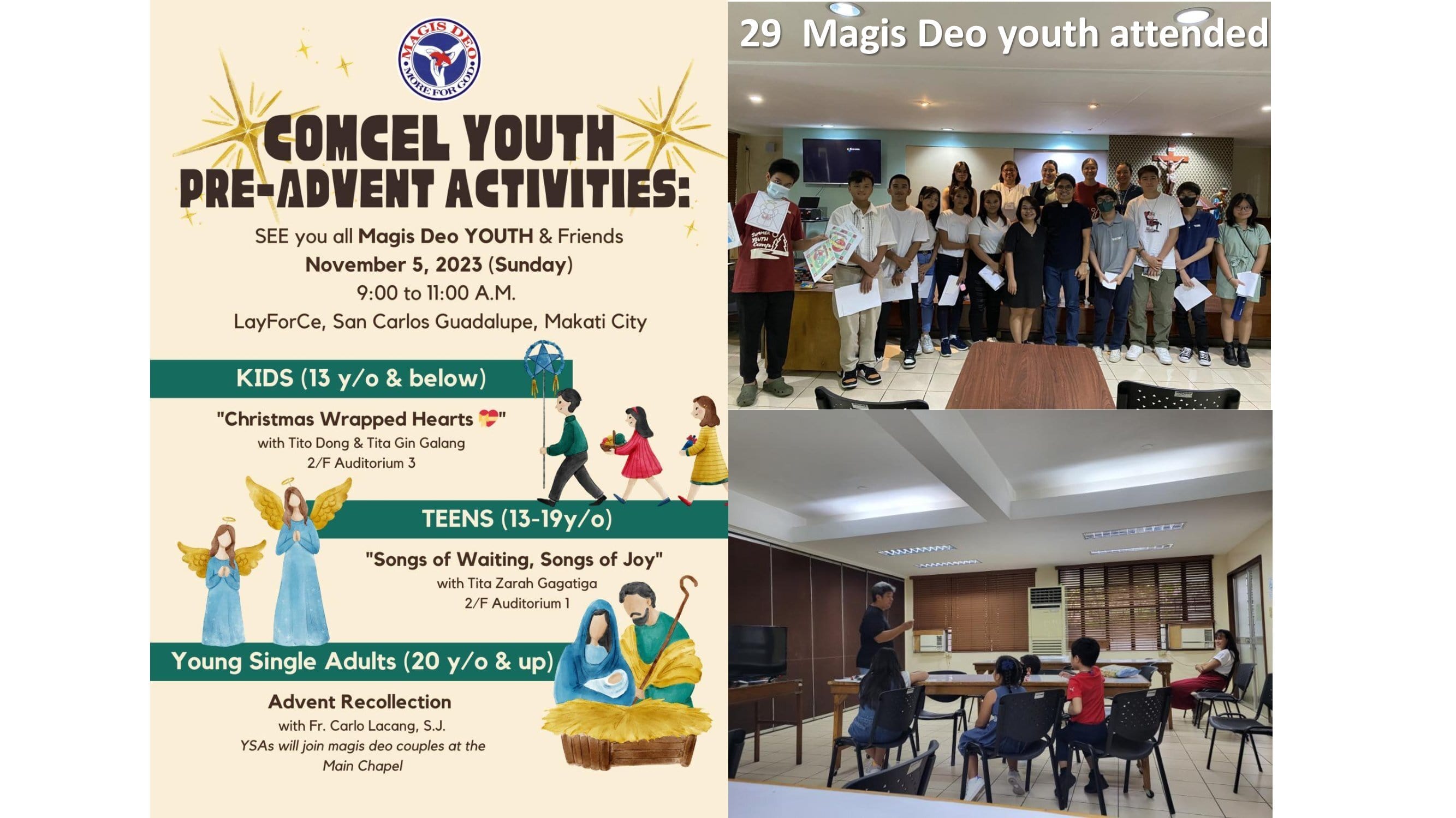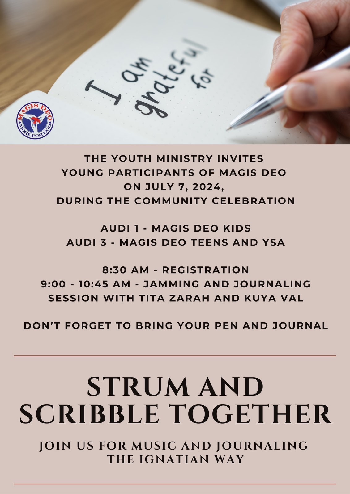Provide the youth with Ignatian formation towards mature relationships with God, family and community appropriate to their life stages. Enhance their service and leadership capacities Provide them with opportunities for community involvement to build God's kingdom within and beyond the Magis Deo Community